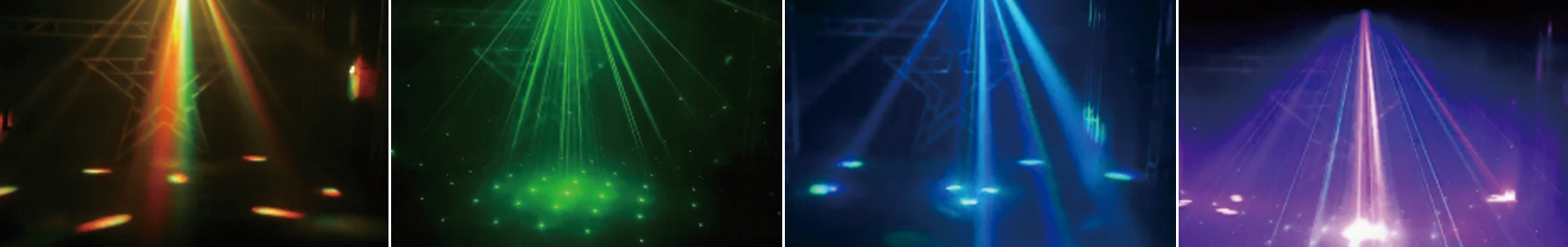 - Комплексная RGB-лазерная система: Наличие четырёх лазеров (RGB) позволяет создавать не только точечные акценты, но и простые лазерные рисунки, линии и цветовые смешения (например, белые точки). Это добавляет прибору совершенно новое, графическое измерение.
