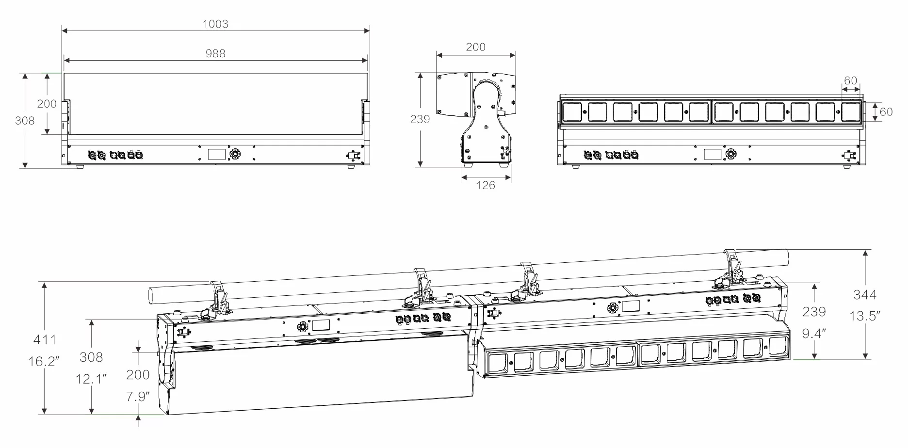 - Индивидуальное пиксельное управление: Каждый из 12 мощных RGBW-модулей можно контролировать независимо (режим 64CH), создавая сложные цветовые градиенты и движущиеся паттерны по всей длине прибора.